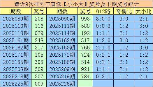 上期回顾:排列三第2025225期奖号为009,组三,大小比开出1:2,直选分布为:小小大。