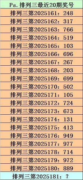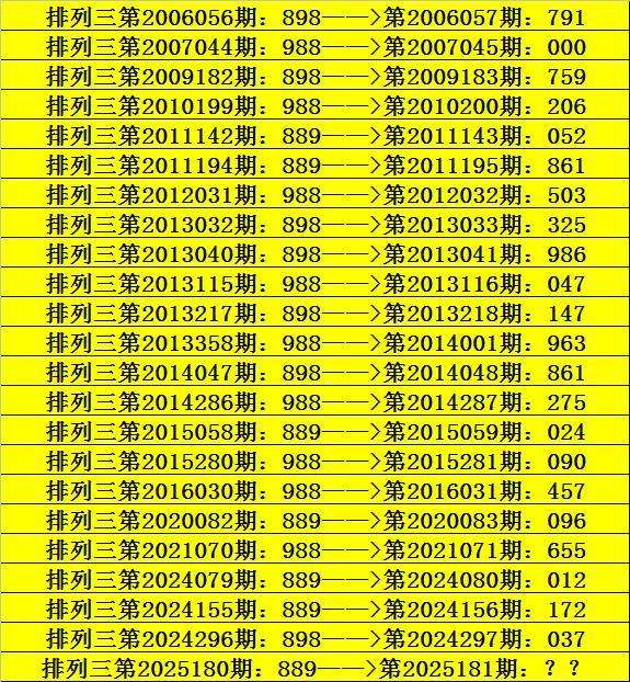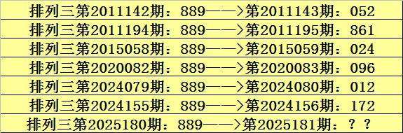第2025180期排列三奖号为889,历史上该号码直选出现7次,下期奖号分别为:052、861、024、096、012、172。