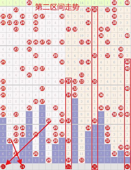 第二区间。21号这个位置的话还是有一个明显的落位,那么24号这个位置的话也是要考虑有一个不错的走势。31号走到重的位置还是要考虑的。35号这个位置。应该可以考到有落位的可能性。然后最后40号这个位置的话,还是要考虑有落位的可能性。