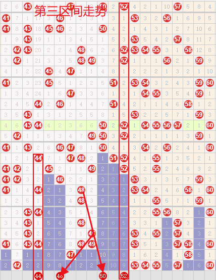 第三区间。44这个号码的话,有一个二二的走势,本期还是要考虑进去的。那么48号这个位置的话,是一个斜连号的一个遗漏码,那么这个位置还是要考虑有一个落位。50号这个位置的话,遗漏了十一期。52号的话遗漏了一个九七,那么这两个号码的话,本期考虑应该是有一个号码要落位的。那么52号的话可能是一个首选。