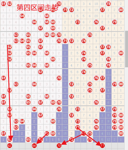 第四区间62号这个位置的话,还是有一个重号的走势。那么66号这个位置的话,走到一个斜连号的一个位置,那么还是要考虑的,那么70这个位置有一个格五七的号码,也是一个偶数格,起码的一个斜连号。大家要注意一下,那么77号这个位置的话,可能是今天的最后一个号码,因为77这个位置确实走到了一个斜连号的一个遗落码的位置。