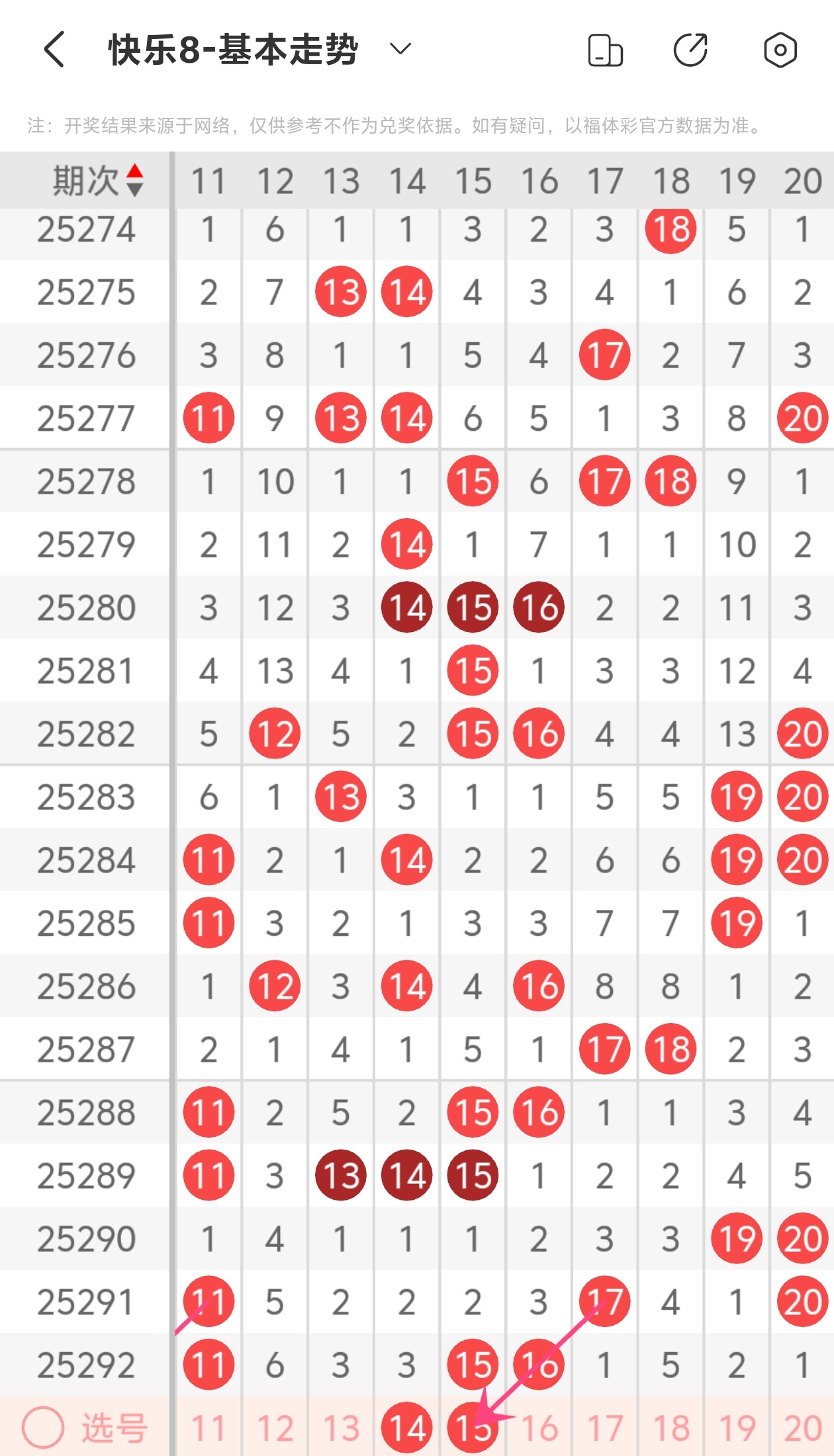 上期第二区间开出11 15 16,今天推荐14 15,从走势图上可以看出我的分析。