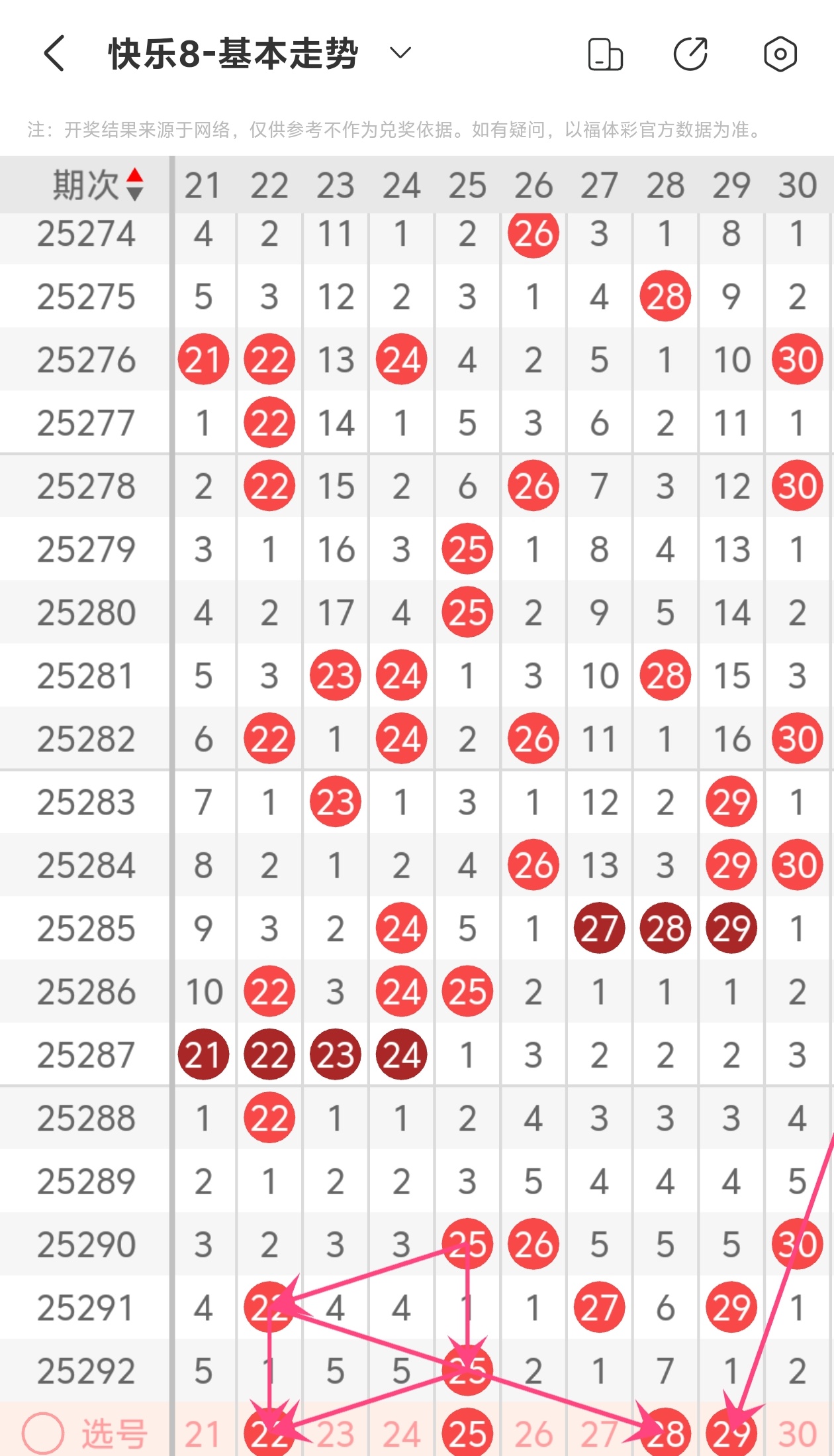 上期第三区间开出25,本期我们可以从上面走势图中看到选号的思路,本期推荐22 25 28 29