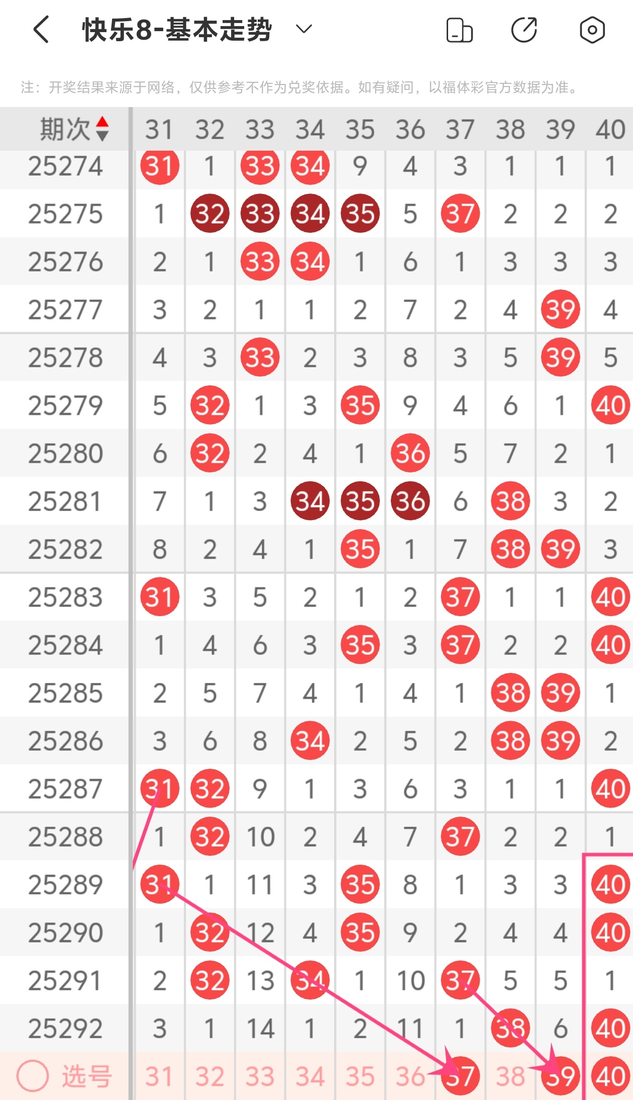 上期第四区间开出38 40,本期我们可以从上面走势图中看到选号的思路,本期推荐37 39 40