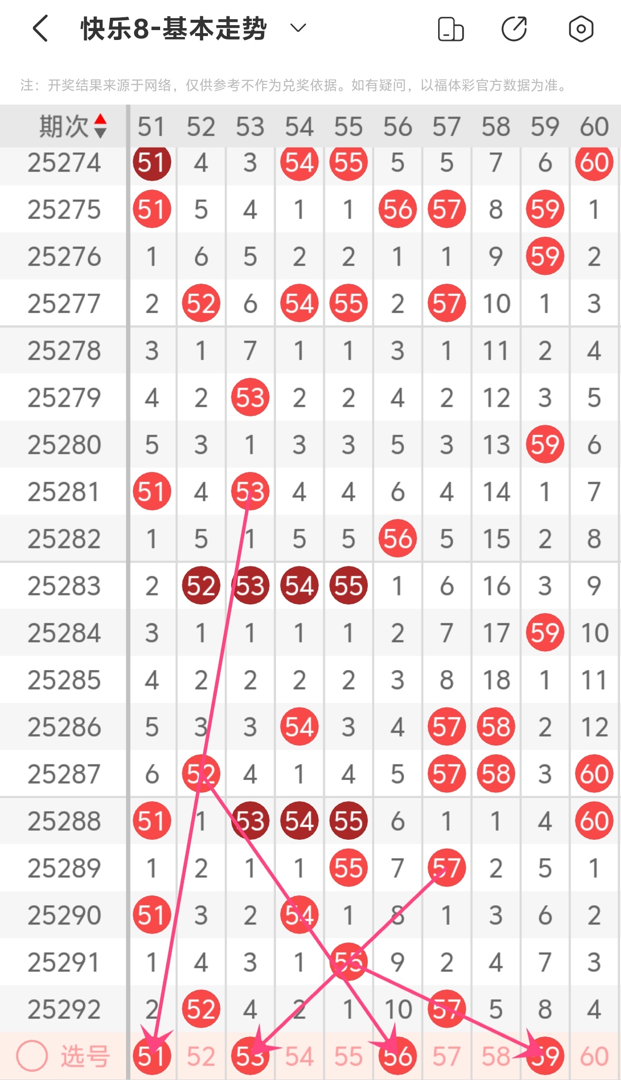 上期第六区间开出52 57,本期我们可以从上面走势图中看到选号的思路,本期推荐51 53 56 59