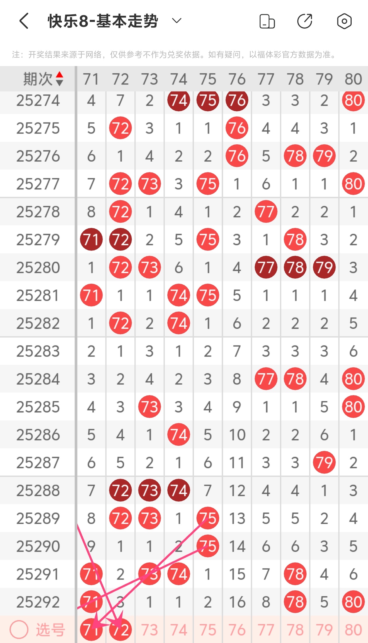 上期第八区间开出71 78 80,本期我们可以从上面走势图中看到选号的思路,本期推荐71 72