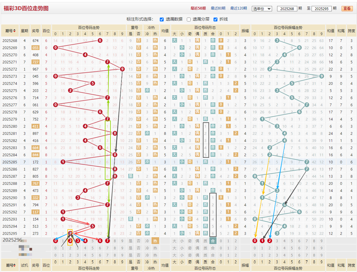 百位近期走势:4/6/8/1/8/8/7/4/3/7/1/1/5/2,质数占优开出8期,质数又连出6期本期看合数04689,大家看上图右边振幅黑色线7/4/1斜线等隔走对应数字13,蓝色线4/3/2下来对应数字04,黄色线2/1/0下来对应数字2,上图左边褐色张987等隔走来,重点看绿色线7中间隔8期上下隔2期4期,很正的走势,黄色线期综合上述百位推荐:012347