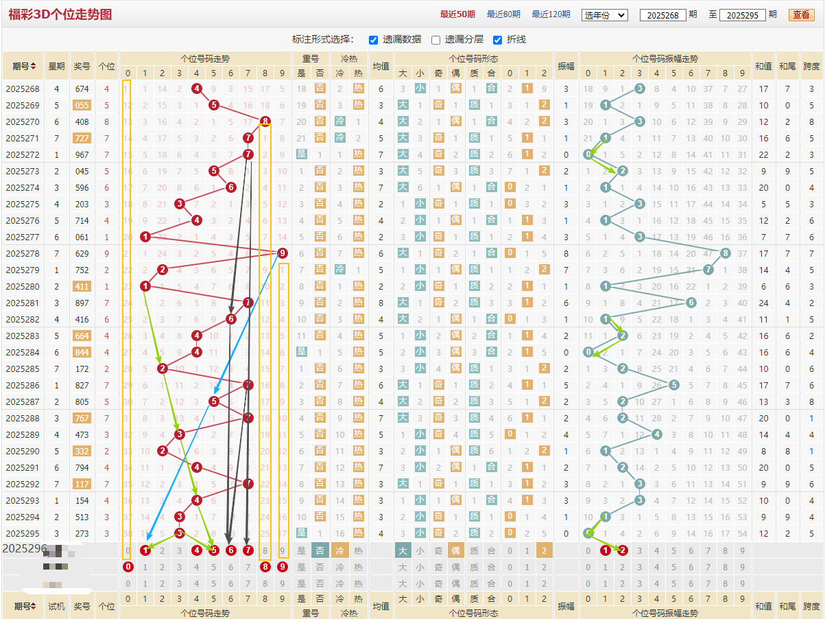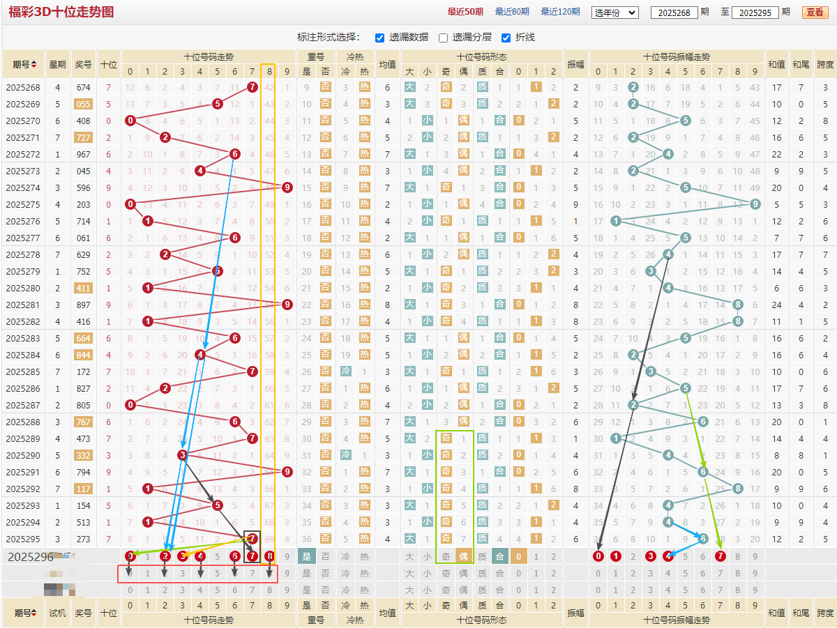 个位近期走势:6/4/4/2/7/5/7/3/2/4/7/4/3/3,从大小形态看小号偏多出9期,从大小看本期侧重点放在大号上面,入上图黑色箭头7/6和77 ,蓝色箭头9/5/1,绿色线1/2/3/4/5走势都符合当下趋势,振幅看绿色012折线对应数15,从冷热形态看出了16期热号089处于冷态近期可关注,综合上图分析个位推荐:145678