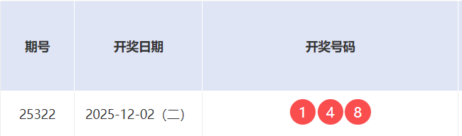 排列三第25322期(2025年12月2日开奖)的开奖号码为 1 4 8。