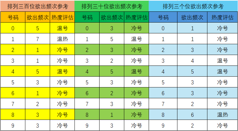 012路分析:上期012路比为1:1:1,完美平衡后常出现偏态。0路号码(0、3、6、9)在连续两期表现温和后,热度有望回升。本期推荐关注2:0:1或1:0:2的余数比。