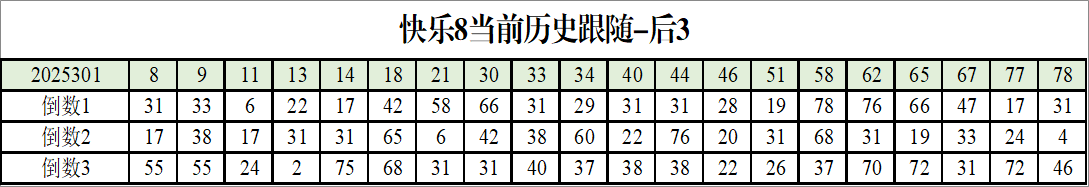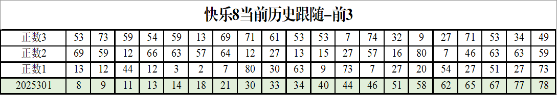 我感觉选热的同时,还要注意防冷条件开出,可以直接选取每个号码跟随出次前三的号码,也可以考虑把出次最后的三个数字加进去,不过这样可能号码太多,可以尝试。图上也能看出单独号码跟随的情况,我就不一一统计每个号码的出次了,我这里考虑提高概率,取每个号码历史跟随的前三号码和后三号码,根据2025301期的号码,我关注正数3和倒数3的号码号码为: