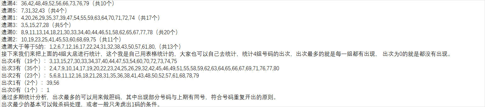 如果把对数和补数合起来有40个号码,中间可能还会产生一下重复数,通过近几期的统计分析,以上期数据进行补数对数计算推算下一期的概率不高。为提高概率,我主要是用前两期的数据来进行对数补数推算,然后再组成一个集合,作为我的第四组大底号码。