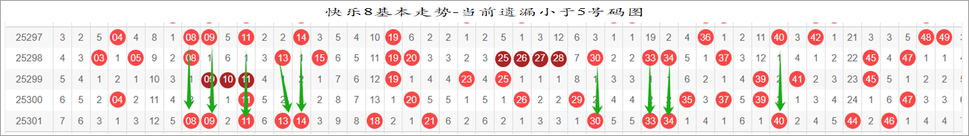 所以这个条件值得关注,从号码分布图上我们可以分析出,遗漏小于5期的号码有: