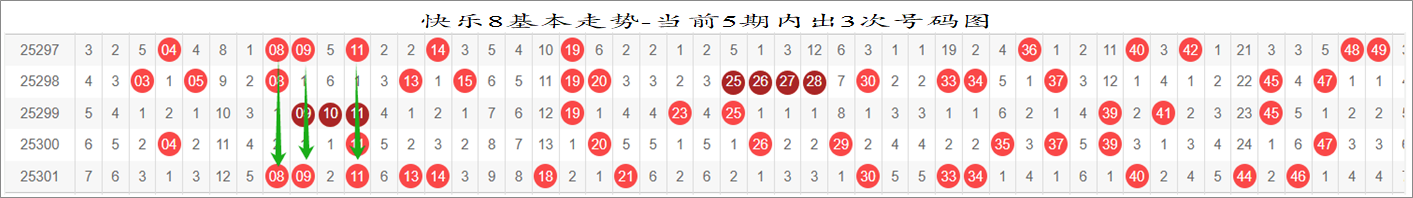 同时我们可以精选一下号码,以近5期的分布中,取出出现过2次的号码,可以理解为取近5期的热码。