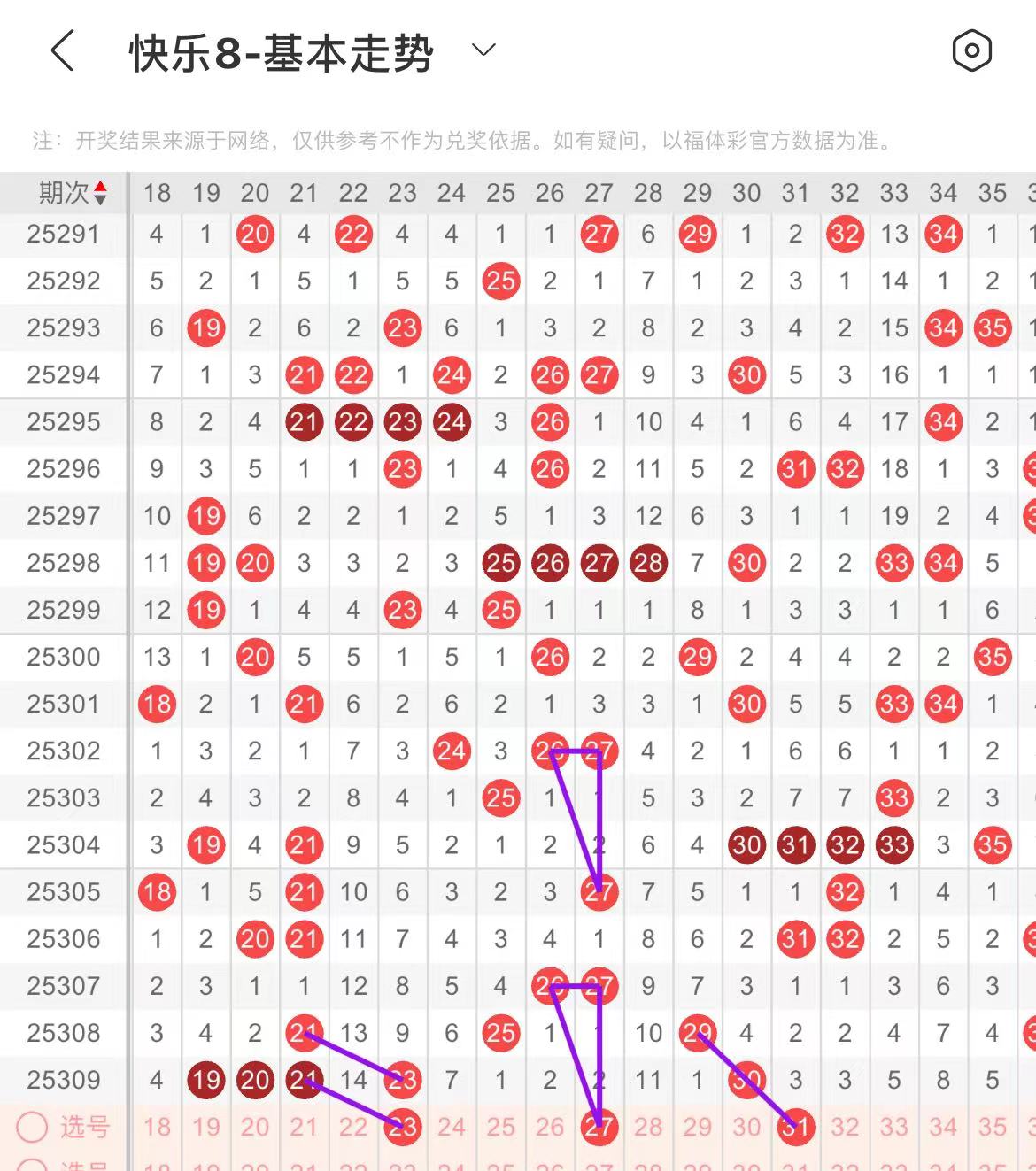 21-30区:本区间上期开出了三个号码,从号码走势图上看,该区号码走势有回暖的趋势,本期出号个数在两个号码左右。有出号走势的号码有23号,21对应23出号,27号,形成一个三角走势形态。