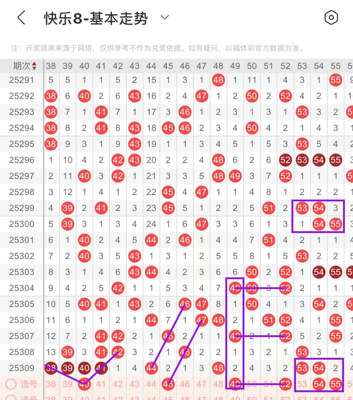 41-50区:本区间上期开出了三个号码,从号码走势图上看,该区现属于热号区,本期出号个数应该还能保持在三个号码左右。本期有出号走势的号码有45号,平行斜连出号走势,防42.45同出,49号,隔期相同出号走势。