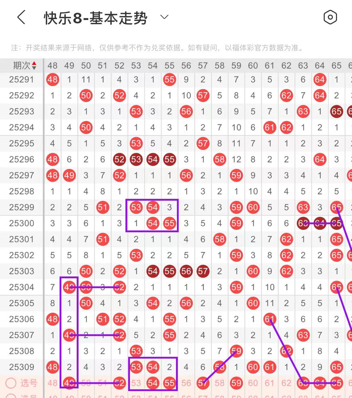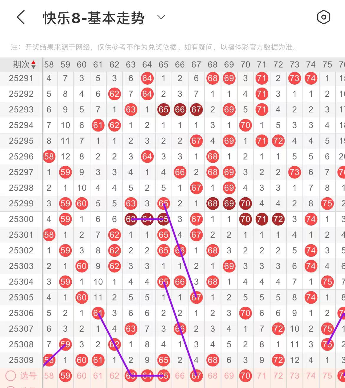 61-70区:本区间上期开出了三个号码,从号码走势图上看,该区号码走势有回暖的趋势,本期出号个数应该在三个号码或以上。本期有出号走势的号码有63号,斜连出号走势,防63.64.65开出三连的可能,67号,斜连出号走势,防67.70同出。