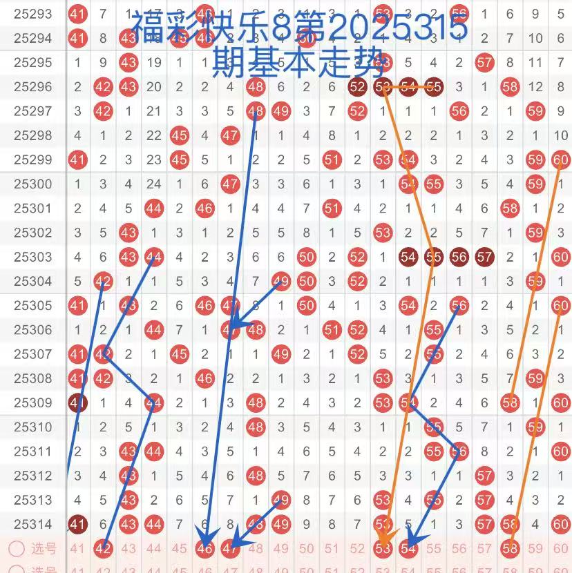 第三区间(41-60):结合近3期第三区开出号码比例3:5:9,预判本期开出号码在4到5个。42号球呈三角回折走势,46号球呈斜跨形态,47号球遗漏8期本期呈斜连走势,注意关注。53号球呈三角回折走势,看好继续走重落号。54号球同样呈三角走势,注意关注。58号球呈斜跨形态,在近期走势相似的趋势下注意走重落号。