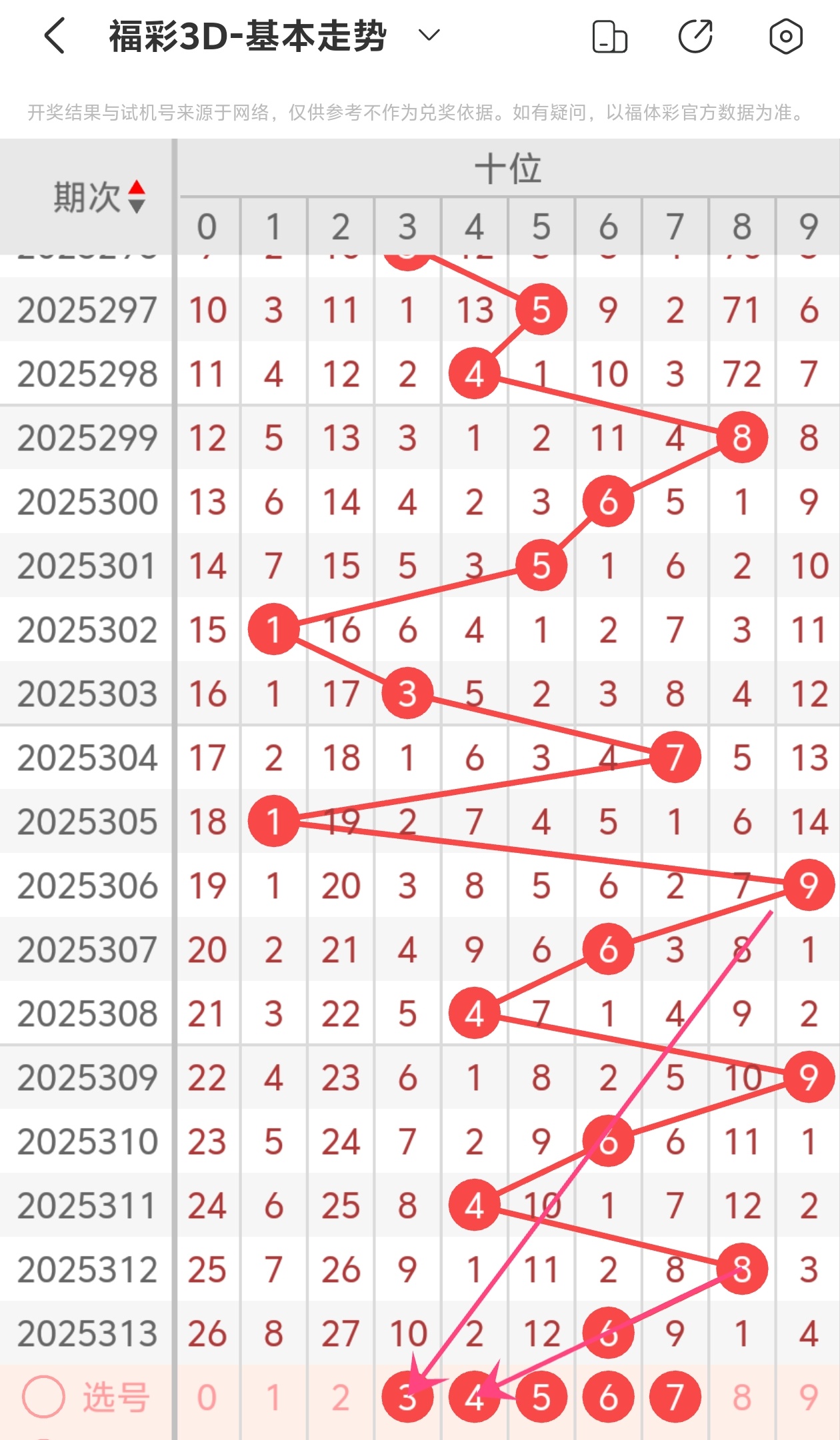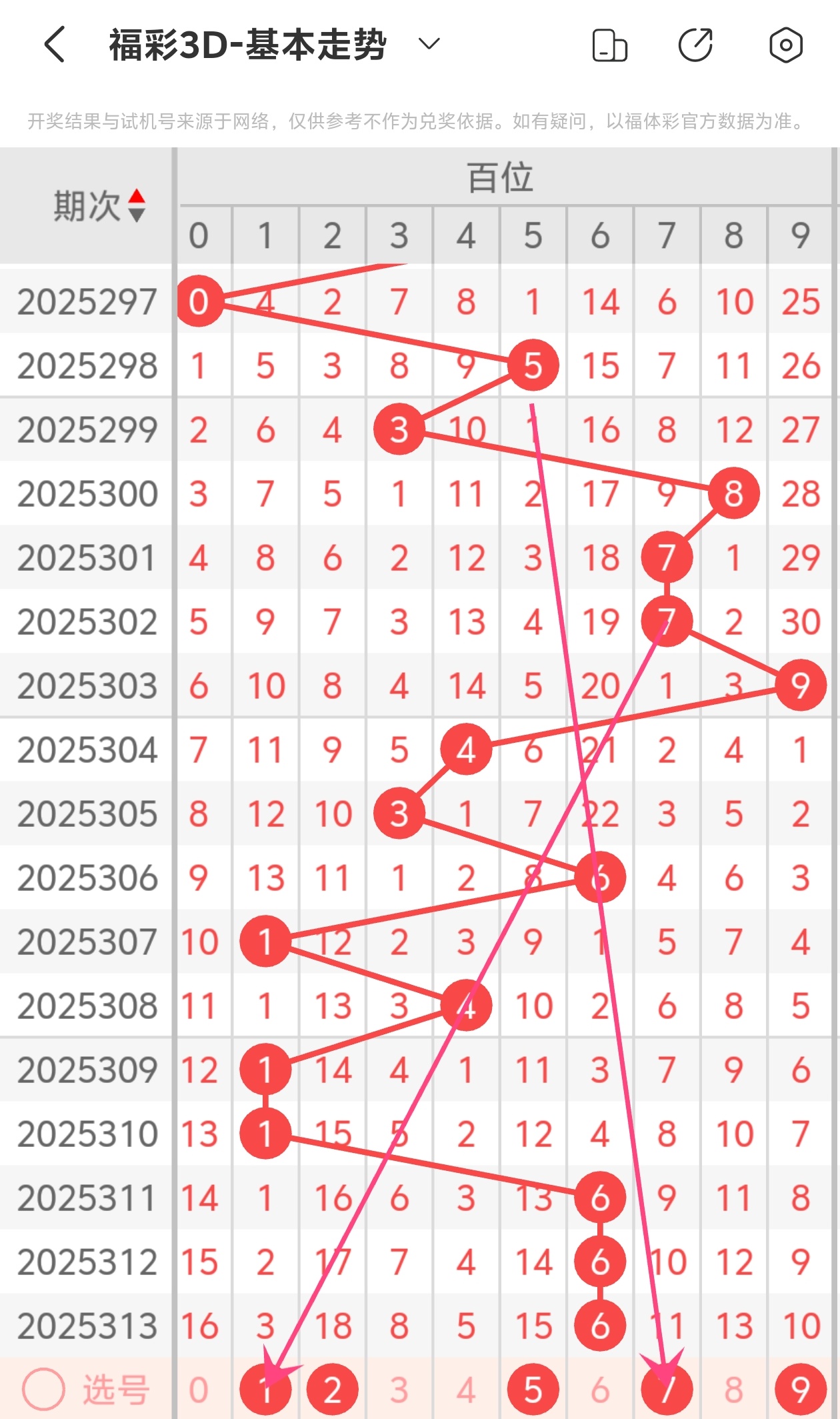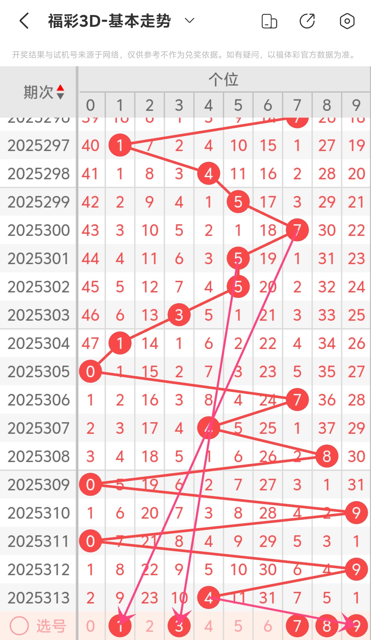 上期百位开出6,本区与上期的跨度为0,本期我们可以从上面走势图中看出选号的思路,1为斜连走势跨度为五,7为斜连走势跨度为一,综合以上分析,本期百位推荐:12579