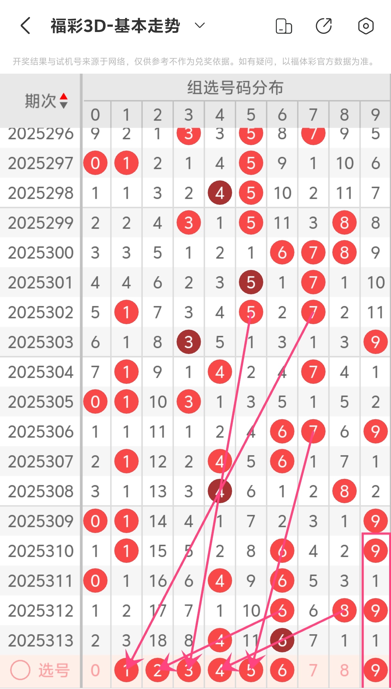 上期开出664组三形态,我们可以从上面走势图中看出本期的选号思路,1为斜连走势,2为斜连走势,3为斜连走势,4为重号,5为斜连走势,6为重码,9为对称直落号。