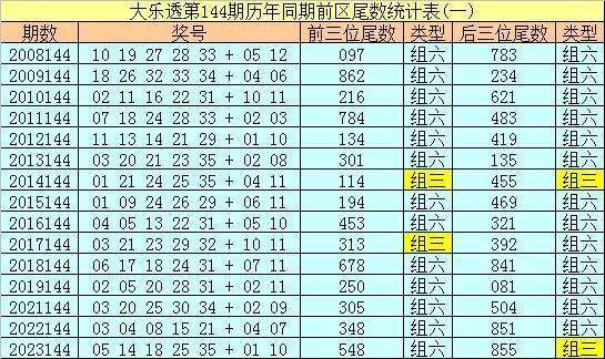 在大乐透第144期历年同期奖号中,前区后三位尾数出号频次分别为:尾数1、4、5出现7个,尾数3、8出现6个,尾数2出现4个,尾数9出现3个,尾数0、6出现2个,尾数7出现1个。其中尾数数字三类型豹子、组三、组六次数比为0:2:13,今年同期后三位尾数类型参考组六;