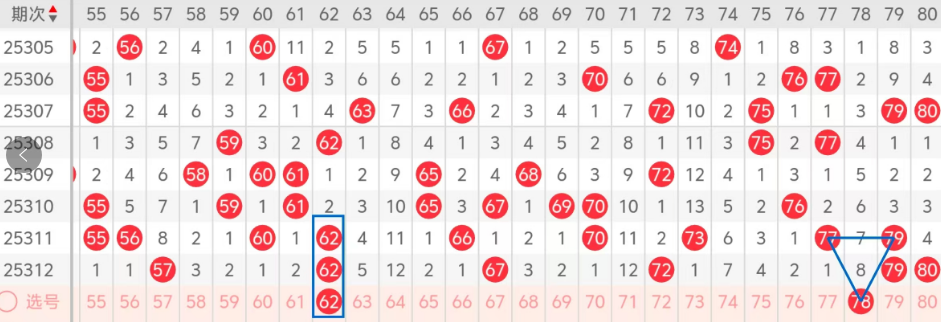 第四区间的走势分析:第四区间上期开出了五个号码球,主要的落号点位在四区间的前后半区,走出了两奇三偶的形态走势,上期四区间的前半区落下了两个号码球,后半区落下了三个号码球,整体处于温态的走势,根据四区间的走势规律,今天的四区间我们主看前半期62三重码的走势形态,后半区主看边码78的回补,这里也形成了一个倒三角的走势形态,这两个号码球大家可以打个选三两胆拖,重点关注78的落位,后半区隔8期回补的号码球,参考为主!