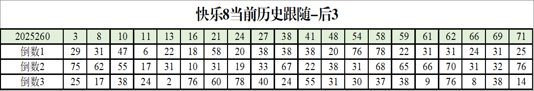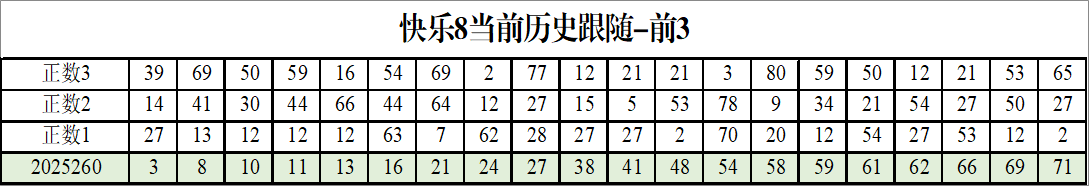 我感觉选热的同时,还要注意防冷条件开出,可以直接选取每个号码跟随出次前三的号码,也可以考虑把出次最后的三个数字加进去,不过这样可能号码太多,可以尝试。图上也能看出单独号码跟随的情况,我就不一一统计每个号码的出次了,我这里考虑提高概率,取每个号码历史跟随的前三号码和后三号码,根据2025260期的号码,我关注正数3和倒数3的号码号码为:
