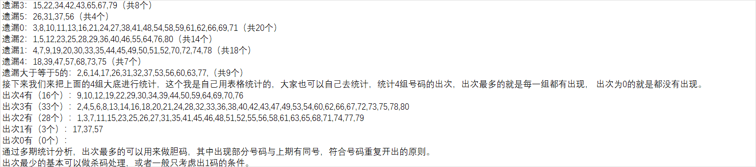 如果把对数和补数合起来有40个号码,中间可能还会产生一下重复数,通过近几期的统计分析,以上期数据进行补数对数计算推算下一期的概率不高。为提高概率,我主要是用前两期的数据来进行对数补数推算,然后再组成一个集合,作为我的第四组大底号码。