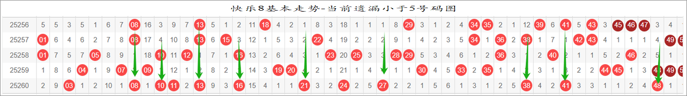 所以这个条件值得关注,从号码分布图上我们可以分析出,遗漏小于5期的号码有: