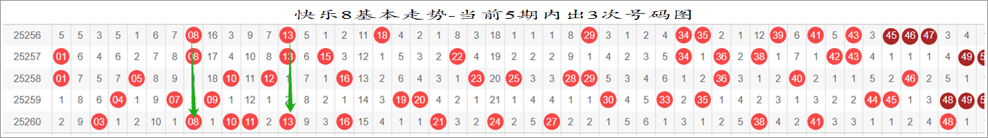 这个条件可以理解为追热号,主要是选取遗漏小于5期的号码来做大底,通过号码分布图我们也能看出,每期都有重复号,都有上期号码的相邻号,再仔细观察下面的部分分布图,2025260期,按照【号码(遗漏)】的方式统计出来是:3(6),8(2),10(1),11(12),13(2),16(1),21(4),........。可以看出遗漏小于5的号码比较常见,这就是一个大概率事件,我们就可以用这个梳理出一部分号码,用来作为我们交集的一组号码。
