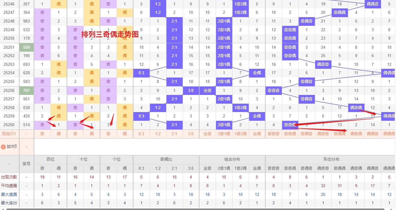 排列三 奇偶分析:从上图可以看出排列三100期内百位奇偶比约为45比55,十位奇偶比为47比53,个位奇偶比为48比52,十位的比值比较均衡,但是百位的比值偏差就有点大,历史奇偶形态近2期开出奇奇偶后下一期的走势为,第178期开出奇奇偶后179期开偶偶奇, 第184期开出奇奇偶后第185期开偶奇奇,第195期开出奇奇偶后第196期开偶奇偶,根据近期的排列三奇偶走势分析,“偶偶奇”与“偶奇奇”这两种形态均已进入冷态阶段,遗漏期数相对较长。从概率学的角度看,任何组合长期遗漏后,其回补的动能都会不断增强,虽然无法精确预测其具体开出的时间,但当前已值得引起我们的高度警惕。重点防范这两种冷态组合的可能反弹,所以排列三2025261期奇偶形态推偶偶奇与偶奇奇。本文由彩虹多多钱是生命动力所著,请勿转载