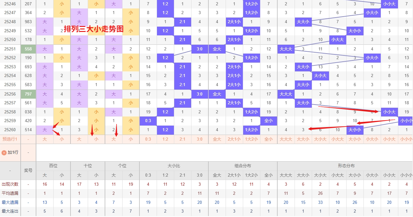 排列三 大小形态分析:从大小走势图上可以看出排列三100期内百位大小比约为47比53,十位大小比约为46:54,个位大小比约为51比49,除了百位和十位奇数比偶数多,个位是偶数比奇数多。历史数据近2期开出大小小下一期的走势为,第177期开出大小小第178期开大大小。第184期开出大小小后第185期开大大大,第195期开出大小小后196期开小大小。近期排列三大小走势分析,“大大小”组合作为当前明确的热号,表现极为活跃,其热态具有明显的惯性特征,短期内存在持续连下的可能性,必须作为重点防守对象。与此同时,“大大大”组合近期出现频率有所回升,已从冷态逐步转为温号,这种势头的转变往往预示着其有进一步转热的潜力,需要密切关注其发展动向,提前进行布防。综合来看,最佳策略是采取“追热防转热”的思路,在紧跟“大大小”热号趋势的同时,也要警惕“大大大”组合的升温迹象,所以排列三第2025261期大小形态推荐大大小防大大大。本文由彩虹多多钱是生命动力所著,请勿转载