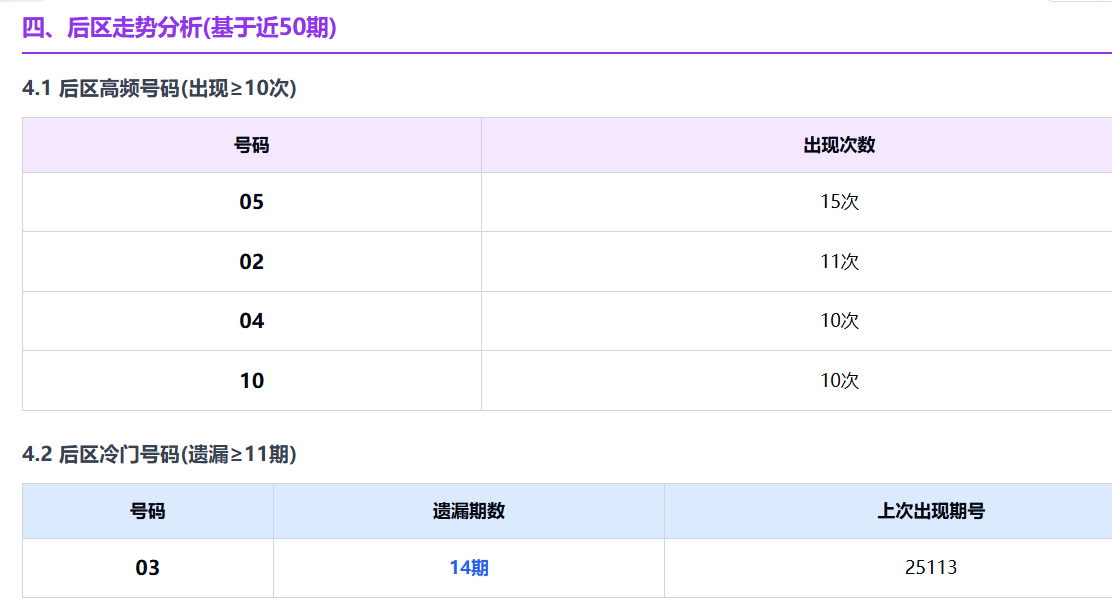 高频号方面,05(15次)稳居榜首,02、04、10也在高频区间;而冷号中最醒目的当属03号,已经遗漏14期未见踪影,成为后区潜在的补位焦点。