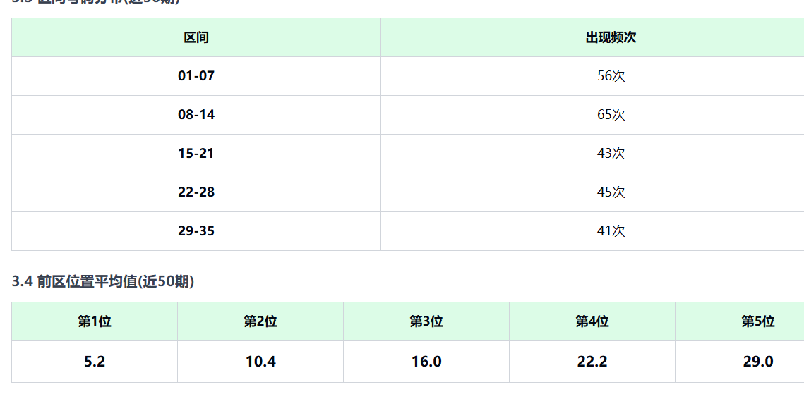 近50期统计显示,08-14区间最热(共65次),紧随其后是01-07区间(56次)。这意味着低位区近期火力不减,而15-35区间呈现波动性较强、起伏大的态势。