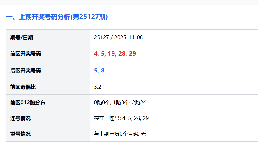 第25127期的大乐透,前区号码开出:4、5、19、28、29;后区则为5、8。这一组号码看似平平,却藏着不少细节。