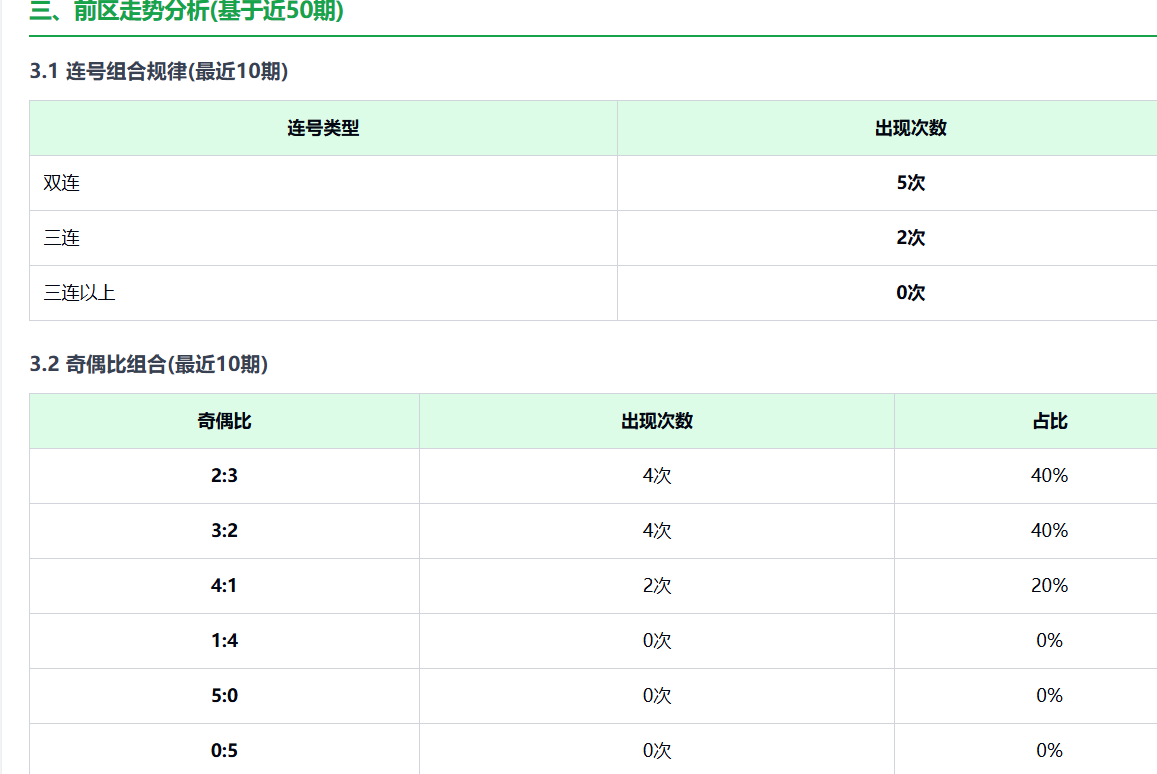 在最近50期中,前区奇偶比例稳定分布在2:3或3:2之间,合计占比达80%。也就是说,偏向极端(全奇或全偶)的情况非常少见,稳态分布仍是主旋律。