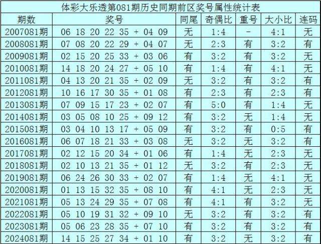 体彩大乐透第081期历史同期开出18次奖号,其统计详见下表: