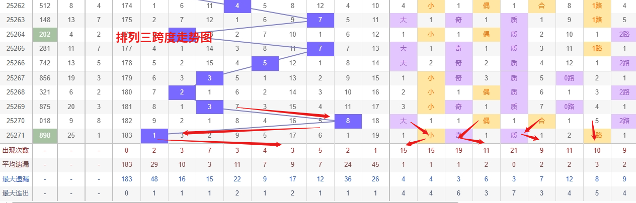 排列三 跨度分析:从上图可以看出近100期的跨度大小比约为48比52,跨度奇偶比约为55比45总体来看还是比较均衡的,但跨度大小之间有点差异。我们再从历史开出1跨后下一期4跨度数据来做参考。最近10期跨度大小比约为6:4期开出小数跨度过多返回大数跨度的概率更高一点。历史开奖近2期出8跨以后的走势为189期开出1跨后下一期走5跨走出4振幅,第200期开出1跨后下一期走4跨走出3振幅第212期开出1跨后下一期开出2跨走出1个振幅。连续多期小振幅。近期排列三跨度走势呈现出清晰的热温分化格局,其中5跨表现尤为抢眼,频繁开出,是当前毋庸置疑的热门跨度,值得我们持续关注和跟进。而与此同时,2跨和4跨目前处于温号区间,但从走势图中能观察到它们有能量积聚、频率上升的迹象,这种蠢蠢欲动的态势表明它们很有可能会在近期转为热号,必须提前进行防范。综合来看,在投注策略上我们应重点追捧热态强劲的5跨,同时务必对处于升温阶段的2跨和4跨保持高度警惕,综合以上分析后得出,本期预计跨度遵从历史会走出小振幅,出1跨度后容易走出1到4个跨度振幅的对称形态,跨度走出1到4个振幅看好的跨度有2456跨,所以第2025272期排列三跨度推荐2456跨。