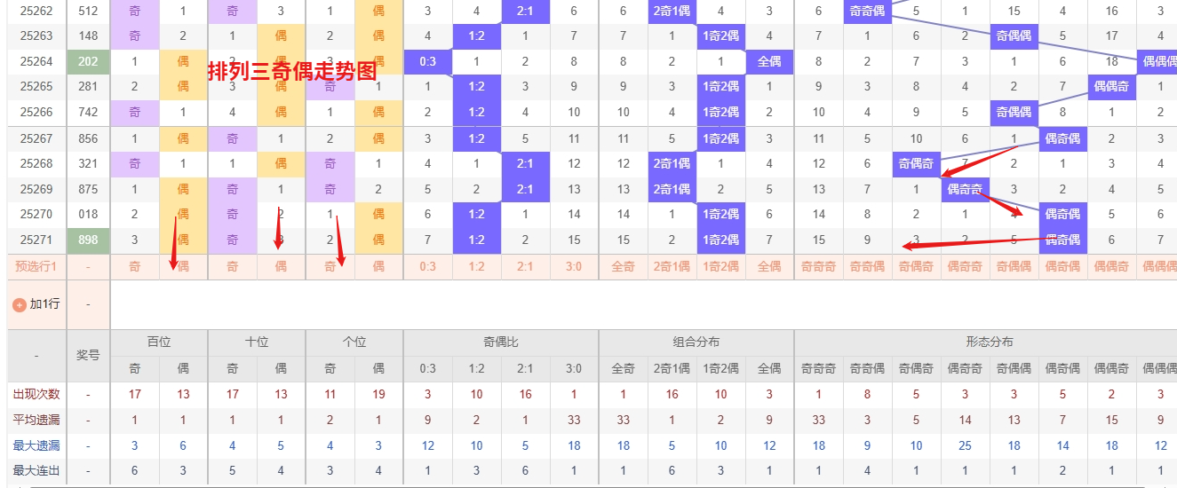 排列三 奇偶分析:从上图可以看出排列三100期内百位奇偶比约为53比47,十位奇偶比为48比52,个位奇偶比为46比54,百位的比值比较均衡,但是个位的比值偏差就有点大,历史奇偶形态近2期开出偶奇偶后下一期的走势为,第193期开出偶奇偶后194期开奇奇奇, 第203期开出偶奇偶后第204期开奇偶奇,第216期开出偶奇偶后第217期开偶偶偶,近期排列三奇偶走势呈现明显分化,其中“奇偶奇”组合表现非常活跃,持续走热,是当前最值得关注的热门形态,“奇奇奇”这类全奇组合则陷入长期冷态,遗漏期数较长,但根据冷热转换的规律,极冷形态往往具备更强的回补动能,须对其突然开出保持高度警惕。因此,在重点关注“奇偶奇”等热号的同时,对“奇奇奇”这样的冷态组合进行设防,所以排列三2025272期奇偶形态推奇偶奇与奇奇奇。