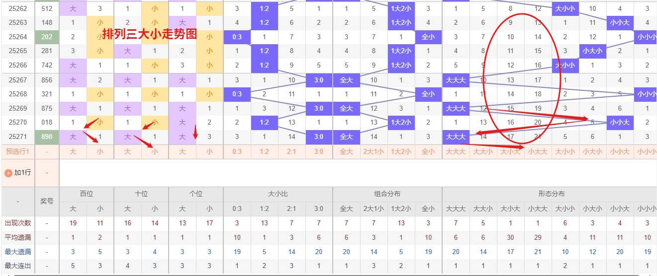 排列三 大小形态分析:从大小走势图上可以看出排列三100期内百位大小比约为52比48,十位大小比约为47:53,个位大小比约为54比46,除了十位奇数比偶数多,百位和个位是偶数比奇数多。历史数据近2期开出大大大下一期的走势为,第187期开出大大大第188期开大大小。第192期开出大大大后第193期开小大大,第205期开出大大大后206期开小大小。近期排列三大小走势中,“大大小”组合表现异常强势,热度很高,其强劲势头很有可能延续并实现连续开出,是当前需要重点追踪和跟进的形态。与此同时,“小大大”组合则处于明显的冷态区间,遗漏时间较长,但正是这种极冷状态积累了强烈的回补需求,我们必须对其突然解冻开出保持高度警惕。综合来看,关注“大大小”这类热号的连下可能,同时务必对“小大大”冷号进行有效设防,所以排列三第2025272期大小形态推荐大大小防小大大。