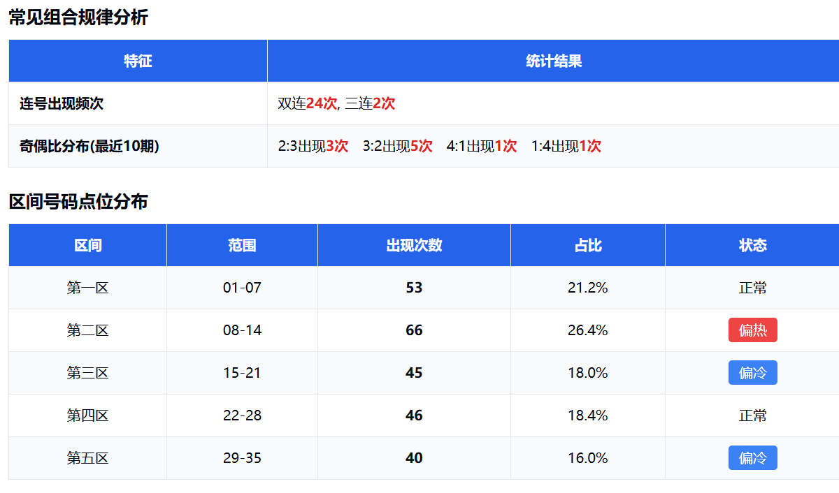 双连号在近50期中出现24次,三连号出现2次,说明“连号”已是常客,平均每两期就会闪现一次。尤其26–27这组连号,落在第四区(22–28),这个区段近几期已连续出现连号,是一个“热区标记”。