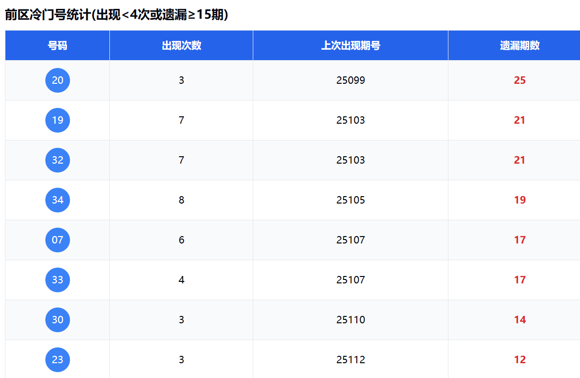 而冷门方面则耐人寻味:20、19、32、34、07、33、30、23等号码近期缺席已久。其中20号遗漏25期,为全区最低温。历史规律看,超过20期未开的号码往往会在接下来10期内出现一两枚回补,因此这些冷区可以纳入观察。