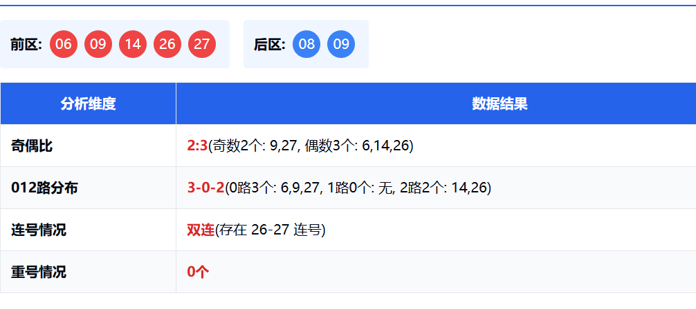 😊上期(第25124期)号码为:前区 06、09、14、26、27;后区 08、09。