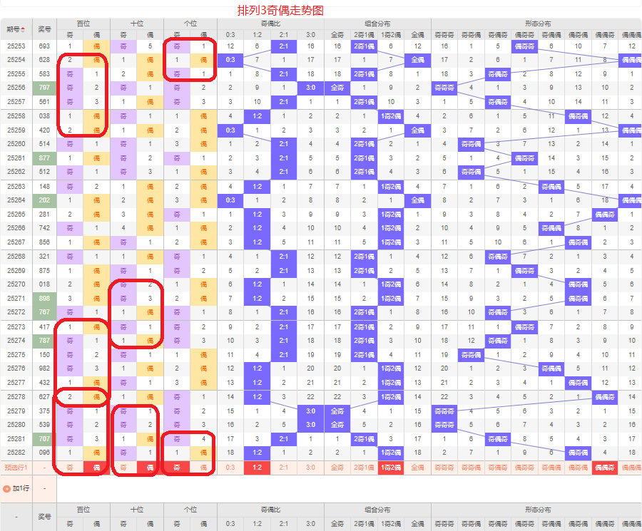 上一期的奇偶比为1:2,两偶的号码组合,从近五期的奇偶数出现情况看,奇数出10次,偶数出现5次,奇数号码出现较多,本期要侧重两偶的号码组合,侧重偶偶奇或偶奇奇的号码组合,根据奇偶组合形态可做五码定位02468/02468/13579或02468/13579/13579