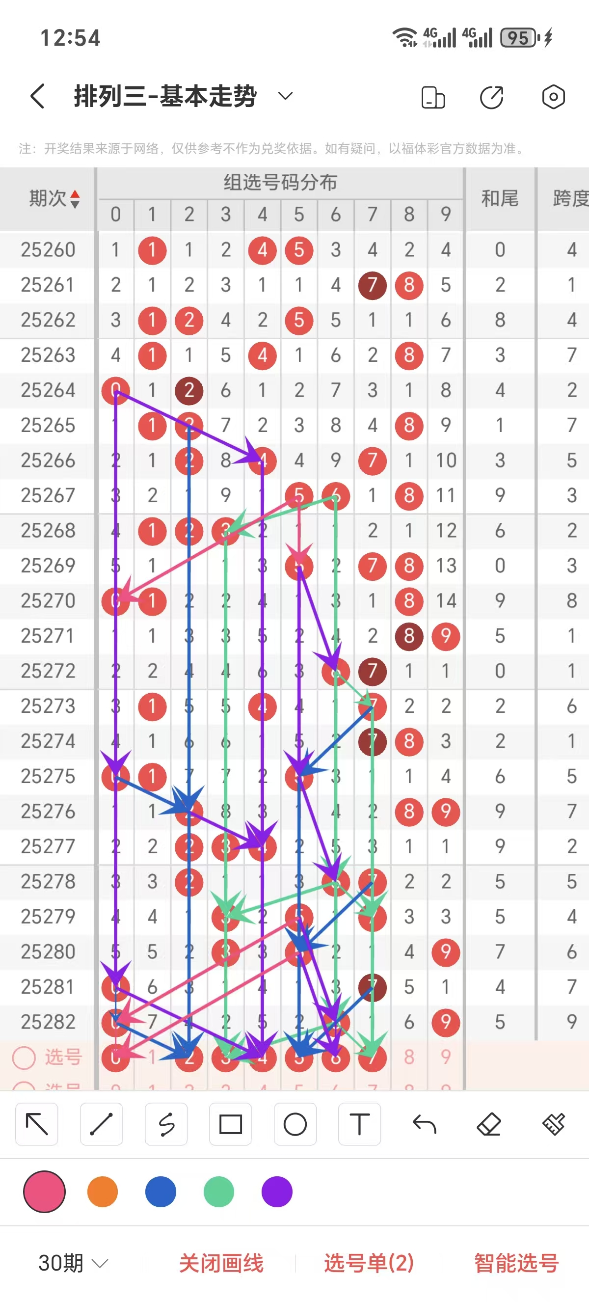通常情况下在五期之内重复一个跨度的概率较高,近五期没有重复的跨度,近五期跨度为5/4/6/7/9,近期01路的跨度较热,本期要侧重3/4/5跨为主的号码组合。选择好跨度就可以从跨度方面选择相应的双胆码组合,双胆码的选取要根据近期和历史的走势进一步的分析选取。