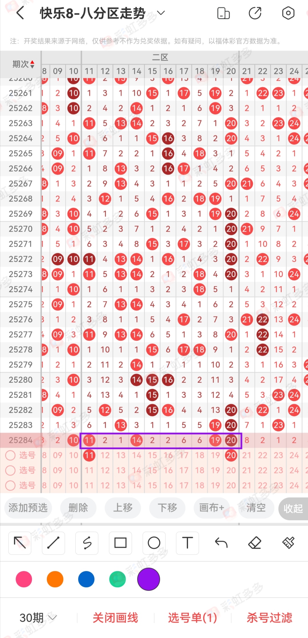 简单的说一下基本理解,具体的我们还是直播的时候谈讨。静下心来,我们看一下目前数据展现出来的大盘是什么。不是说不考虑之前的逻辑,只是说,没有一招鲜,只有参考价值,且存在高频才可以。每一天的号码都会开奖20个,但是不是说没有相同的。我们有遇到过9个重号,也有遇到过多码连号,也有一次没有重号。这里说明了中奖不是太过于清晰。所以我们在选择出手的时候,不要任性,需要看走势的基本形态等。当然希望大家多多中奖,这样子直播间特效不就好多了。来看下今天给大家安排的点,11 20同出,同区间内1尾0尾同出,出现的状态,出现的结构,或者说总结的点非常的多。那么这种有多方向的号码组合到底需不需要考虑。答案是需要的,前天的31 40同出,然40走重带出46。这里归咎于22 40 46的顺位,今天也有类似的顺位3码结构,那么要不要学习,我们晚上再点出来。31 40的位置,考虑尾图,我昨天的直播讲解是大概率不走重,这是高频率,但是始终开出来了,那么今天的11 20同出会不会也有号码走重。其实这里按照3码考虑其实也存在,比方说昨天的25没有开出来,那么规律连线,15 20 25会不会需要20的走重带出25。这里是理想的状态,我想讲的是,20走重带5尾兴许有可能,毕竟0尾总结过,0尾5尾高频。比方说举例昨天的40 45。且45和25的结构大致相同。这里总得来说就是11 20需要考虑重号,紧跟步伐走势。