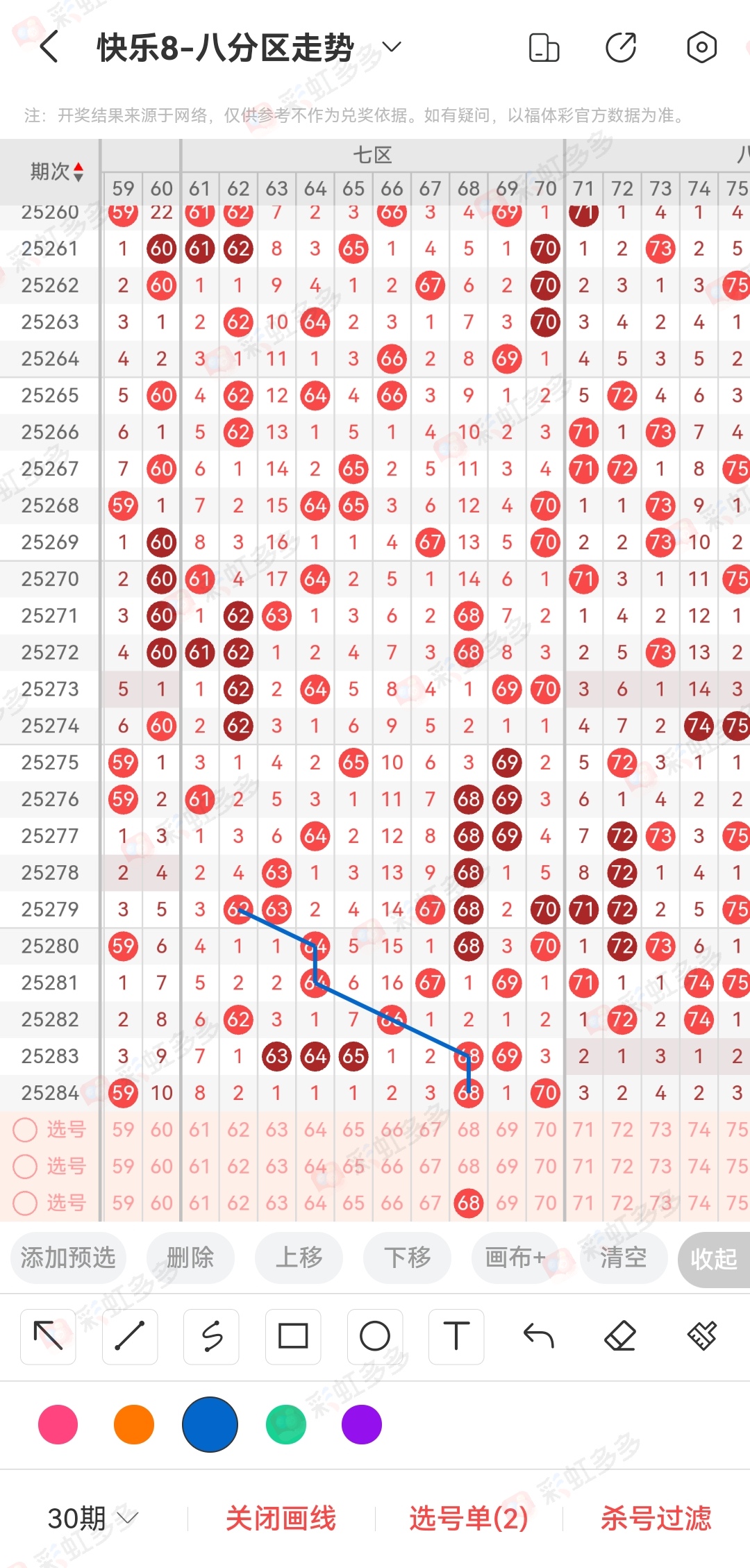 第二张图我们看一下6头这里,会不会有人会说68不会有3重,毕竟这条线上面的64也是2重。这里的形态大家应该是有印象的吧。2头是不是来过,所以这里的点,我的建议看一下2头。先不说70会不会走重,或者会不会顺位72,其实都是有点位的。不能说全部开出来,我们2头有这么一句话,4尾6尾8尾0尾不会全开。那么6头能不能也这样想,多出就是3码,少出就是1码,不出也是有可能的。或者还会有人这样子理解69,或者70同出73。这都是昨天的规律衔接。问题都是很大,是非常大,如果有什么特点的点关联放大,就很有可能一个没有。
