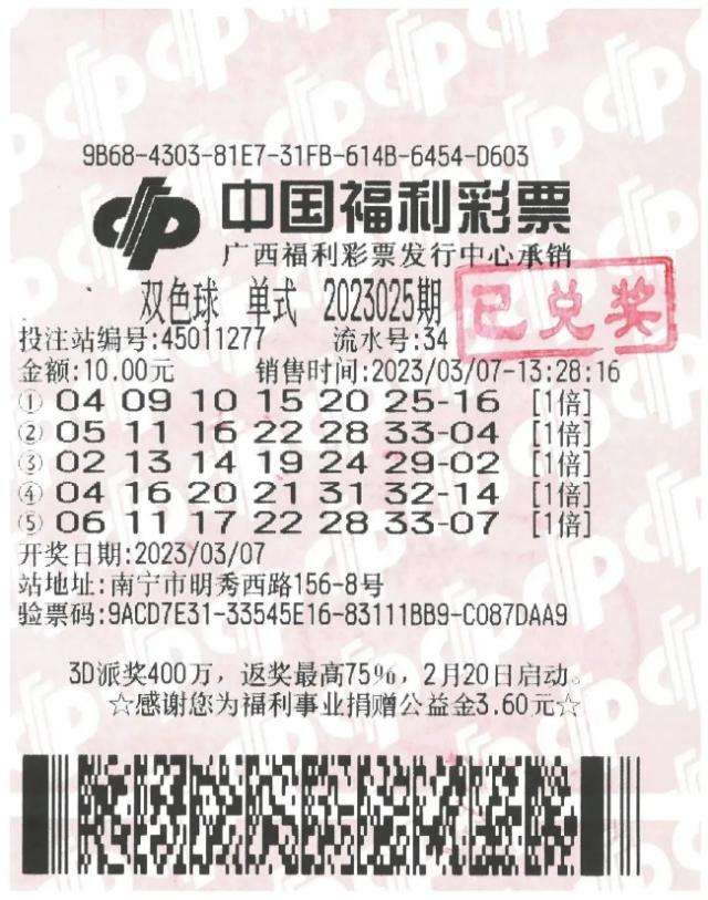 3月7日,跟客户谈完事后已是13点多钟了,赖先生本想找个地方解决下肚子问题,走在路上看到了福彩第45011277号投注站。赖先生说,当时没怎么想,就直觉的走进了投注站,当天正是双色球第2023025期的开奖日,按习惯他先是凭“心水”自选了一张10元的单式票,接着又机选了一张同样是10元的单式票。按着同样的方法,同样的配方,当天他先后购买了快乐8、3D等当天开奖的所有游戏。