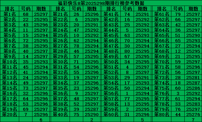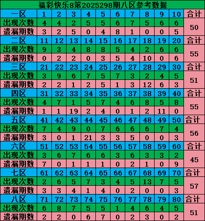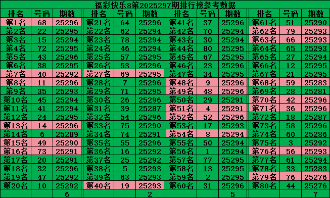最后再把号码分为五区:一区01-16号、二区17-32号、三区33-48号、四区49-64号、五区65-80号,理论上每个区每期应该开出4个号码,2025297期五区比例:5:1:4:4:6