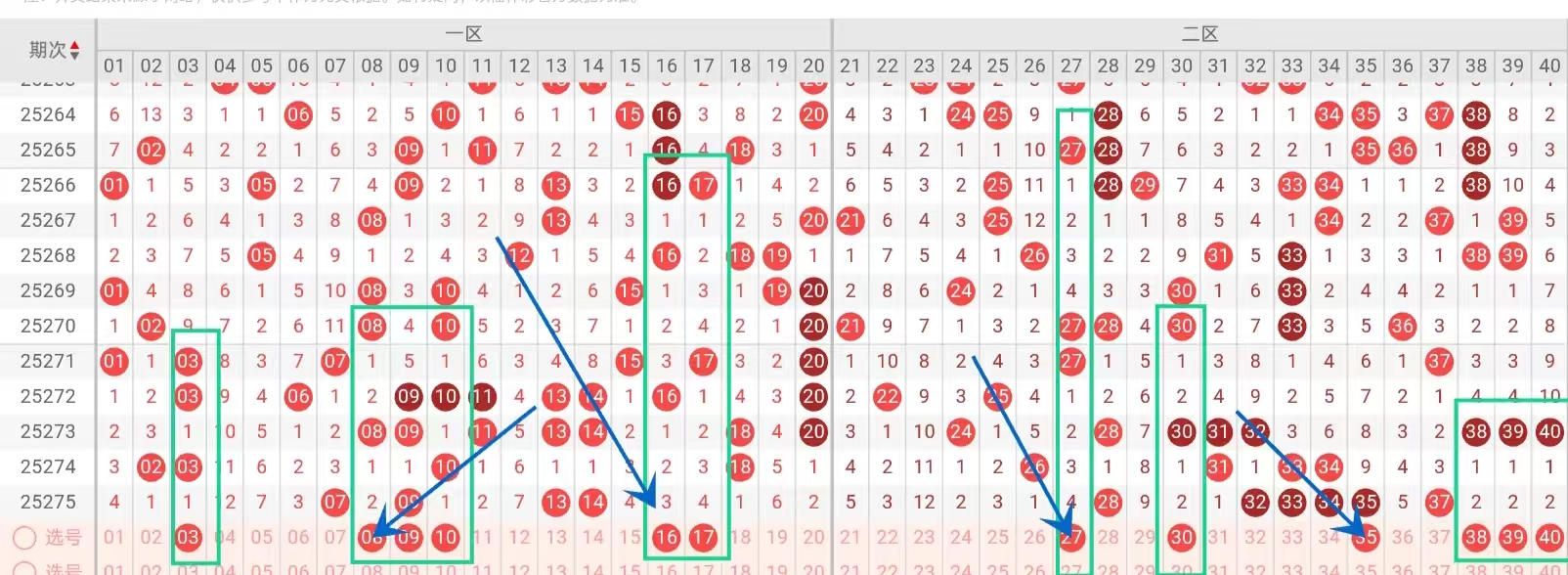 第2025276期福彩快乐8通过以下走势图及一二区间预测分析如下: